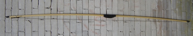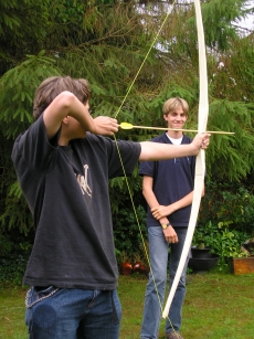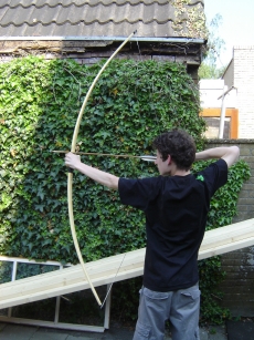 Tim: "De grenen jeugdboog is af, getillerd en ingeschoten, hij is vrij licht maar schiet wel goed. Ik ben 16, en het tilleren heeft niet zo erg lang geduurd; eerst had ik een pijnbank gemaakt en heb de boog 4 uur op spanningshoogte laten liggen, daarna heb ik de boog langzaam doorgetroken tot de treklengte (+/- 72 cm). Ik heb vrijwel nergens hout hoeven weghalen omdat de buiging al egaal was. Ik ben nog steeds aan het twijfelen of ik de boog moet inkorten (om hem zwaarder te maken). Bij een gewicht van 8 kilo zat hij al op 70 cm uittrekking, maar de pijl schiet toch erg ver weg. De boog is 180cm lang, dus inkorten is nog mogelijk (de werparmen zijn over 0.9cm dik, vrij dun ja, maar ik had geen ander materiaal tot mijn beschikking). Misschien nog een tip voor het handvat: Inrollen met touw en vervolgens transparant oplossende houtlijm oplossen in water en daarmee het handvat goed nat maken, dan is er geen beweging meer te krijgen in het touw."