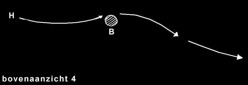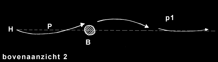 De pijl P ligt schietklaar. B is de (doorgezaagde) boog. Bij het lossen gaat de pees van H naar L, waar de pijl de pees verlaat. Zoals je ziet wijkt zijn richting dan ver af van de ideale lijn H-X.