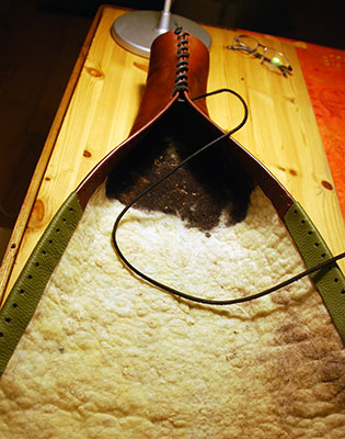 Marc haalt veel voldoening uit het zelf maken en zelf doen. En met mooi resultaat, zoals te zien is aan deze pijlenkokers. In deze quivers worden de pijlen flink in de watten gelegd, want ze zijn luxe uitgevoerd met een binnenbekleding van vilt. Een mooi detail daarbij: de wol voor dit vilt is afkomstig van Marc zijn eigen schapen!
