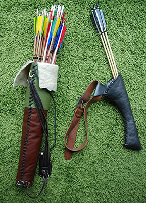 Deze pijlenkokers zijn helemaal met de hand gemaakt, geheel van leer. Overigens maakt Tonnie alles zelf, dus ook handschoenen, armbeschermers, bogen, pijlen en doelpakken. Soms ook de punten en dan van vuursteen natuurlijk!