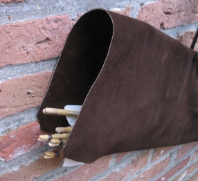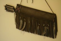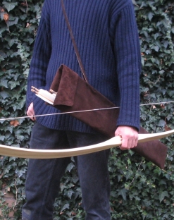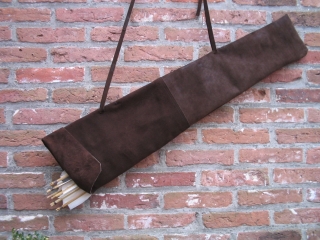Wilko: "Deze pijlenkoker is gemaakt van suède. Ik heb als basis een plastic koker genomen en daar omheen de stof opgemeten. Ik heb 2 kleuren Suède gemaakt, zie bovenflap en onderkant. De riem is van een oude voetbaltas en is dus makkelijk verstelbaar.Omdat de politie in Nederland nogal moeilijk kan doen en het soms slecht weer is, heb ik er aan de bovenkant een flap aan gemaakt, die teruggevouwen kan worden. De flap is van 2 lagen Suède gemaakt. Verder zit er een boord in de bovenkant, met een touwtje en een stop, om de boel dicht te houden. Het nadeel van suède is dat het niet zo goed tegen de regen kan. Doe er dus (als je suède gebruikt) geen kartonnen koker in die gekleurd is, want de suède zuigt de kleuren uit je koker het stof in."